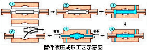 先把管坯放入模腔內,合模,再通過向金屬管材內部加壓和軸向進給補料使其成形為所需要的工件。取代傳統膠脹、油脹技術,減輕重量、增加韌性和強度。